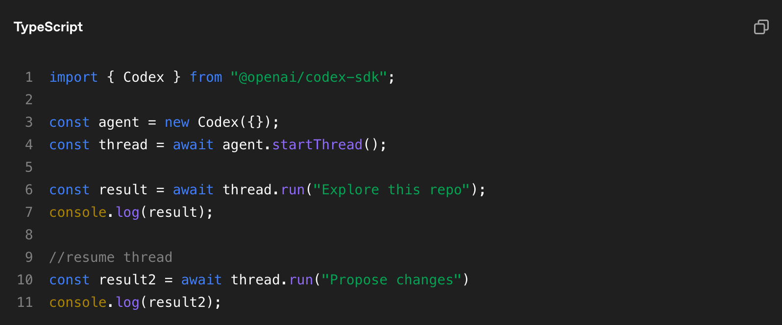 با استفاده از SDK Codex، میتوانید همان عامل را به راحتی در گردشکارها و اپلیکیشنهای خود با چند خط کد ادغام کنید. این SDK خروجیهای ساختاریافتهای برای تجزیه و تحلیل پاسخهای عامل و مدیریت زمینه داخلی برای ادامه جلسات فراهم میکند. SDK فعلاً برای TypeScript در دسترس است و زبانهای بیشتری به زودی اضافه خواهند شد.