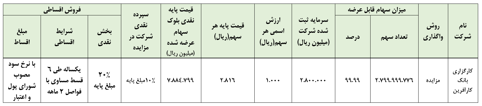 به گزارش برداشت روز، بانک کارآفرین (شرکت سهامی عام) در نظر دارد در راستای اجرای “قانون رفع موانع تولید رقابت پذیر و ارتقای نظام مالی کشور، سهام شرکت کارگزاری بانک کارآفرین (سهامی خاص) با موضوع فعالیت کارگزاری (تحت نظارت سازمان بورس و اوراق بهادار) را به شرح و شرایط ذیل از طریق مزایده عمومی واگذار نماید.