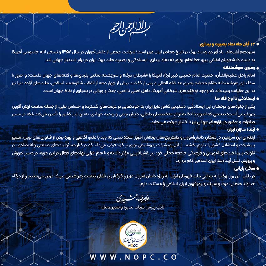برداشت روز » انرژی » پیام دکتر غلامرضا جمشیدی به مناسبت سیزدهم آبان ماه سالروز مبارزه با استکبار جهانی و روز دانش آموز