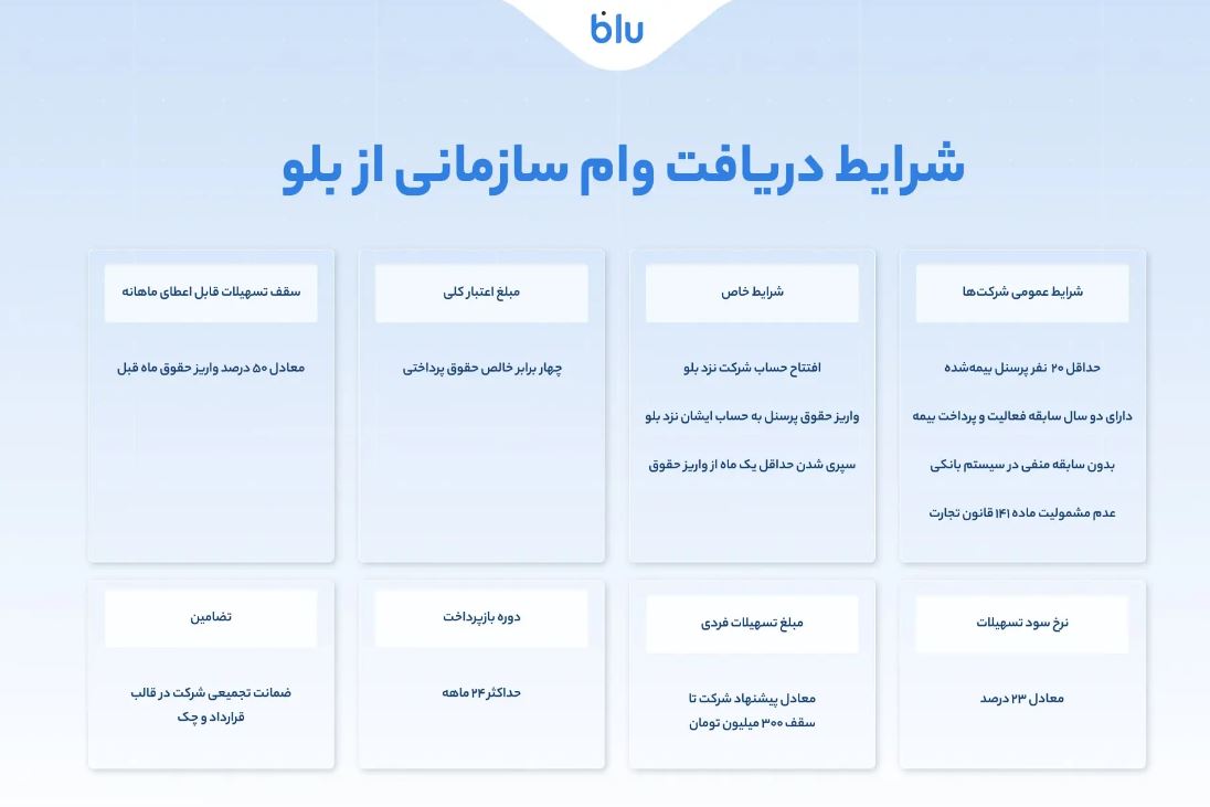 هر شرکتی که حداقل ۲۰ پرسنل داشته باشد میتواند از بلو وام سازمانی دریافت کند. مسیر همکاری با طی کردن مراحل زیر به جریان میافتد: