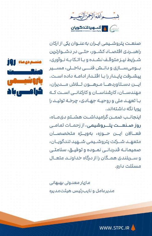 اینجانب ضمن گرامیداشت هشتم دی ماه روز صنعت پتروشیمی از زحمات تمامی فعالان این حوزه به ویژه متخصصان متعهد شرکت پتروشیمی شهید تندگویان صمیمانه قدردانی نموده و توفیق، سلامتی و سربلندی همگان را از درگاه خداوند متعال مسئلت دارم.