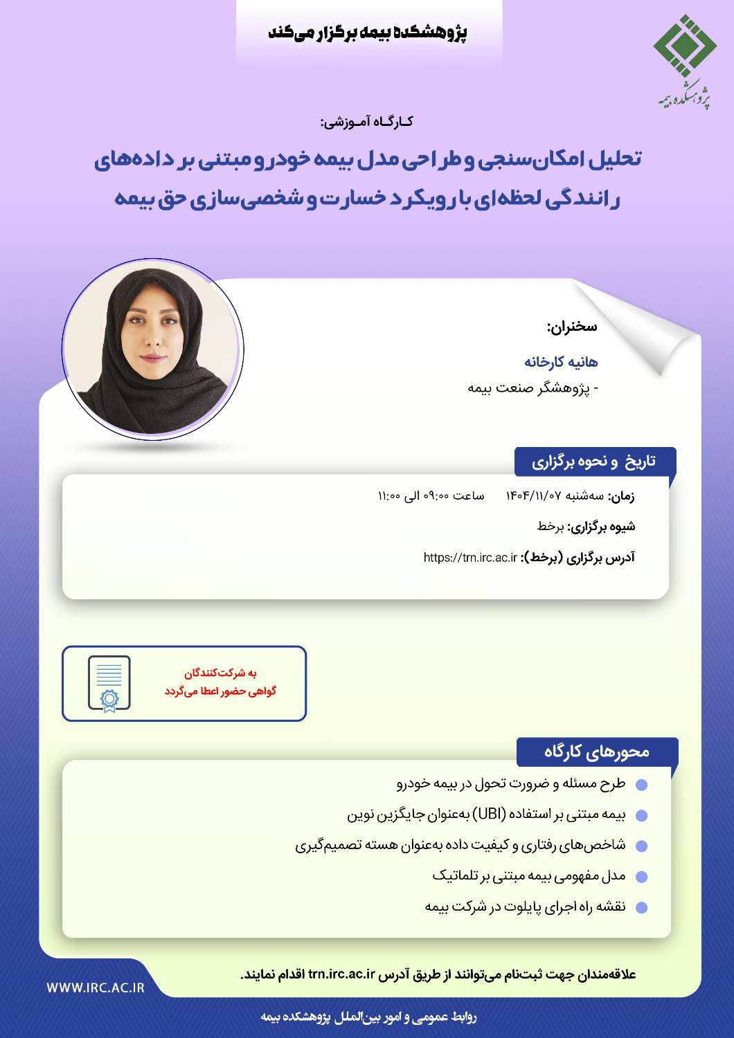 علاقهمندان میتوانند جهت ثبتنام و حضور در این کارگاه از طریق سامانه آموزش پژوهشکده بیمه به نشانی https://trn.irc.ac.ir اقدام نمایند.