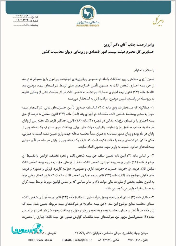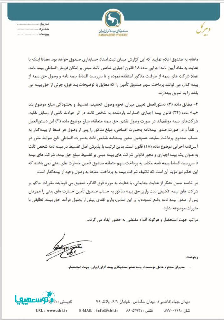 گفتنی است رونوشت این نامه جهت استحضار به مدیران عامل مؤسسات بیمه عضو سندیکای بیمه‌گران ایران نیز ارسال شده است.